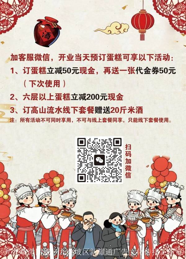 加客服微信,开业当天预订蛋糕可享以下活动: